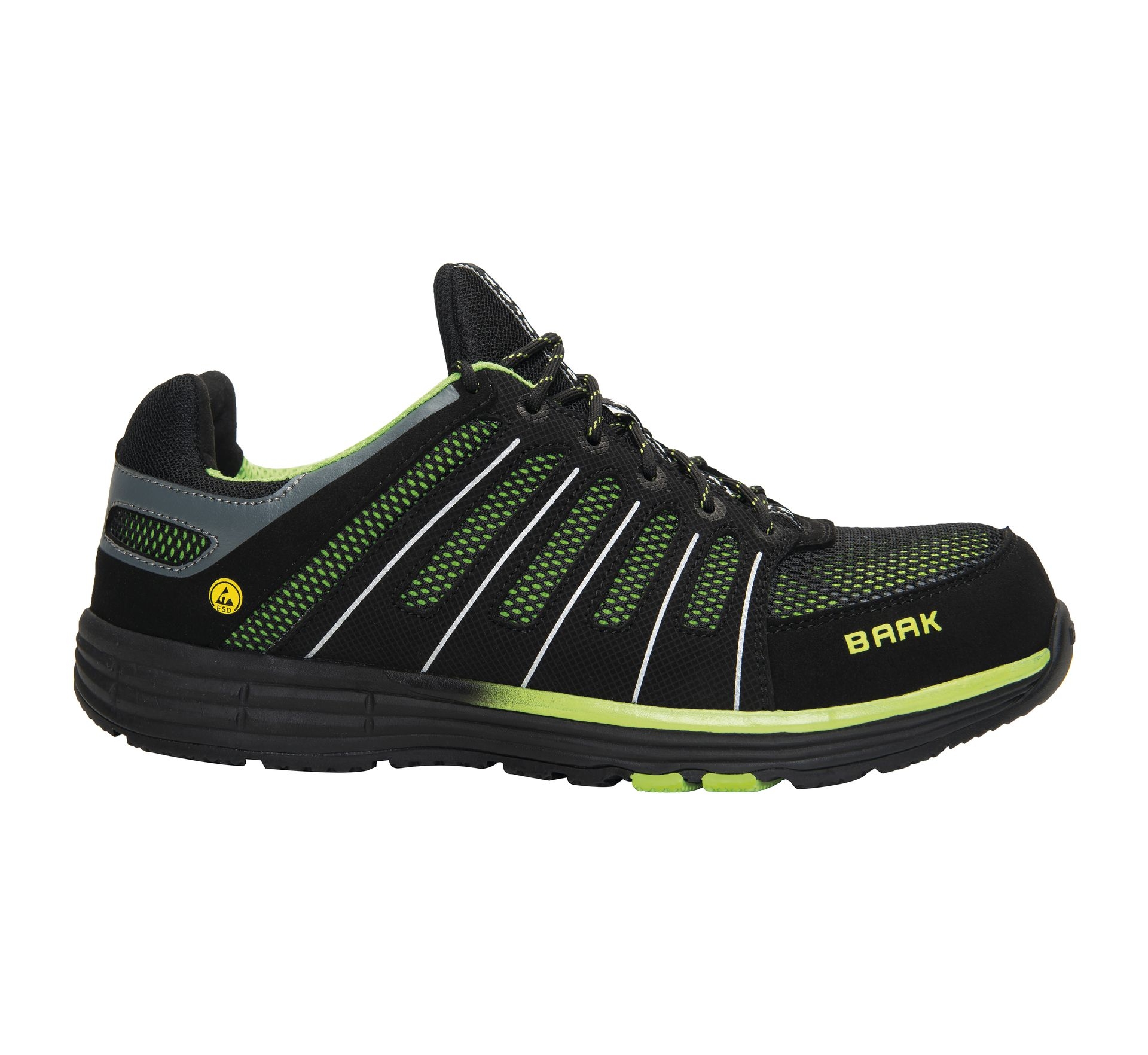 Besonders leichter, sportlicher Sicherheitsschuh mit bequemer Passform, 100 % metallfrei, Weite 12 Breite Composite - Flex - Zehenschutzkappe für gute Zehenfreiheit, textiler, flexibler Durchtrittschutz Schaft aus Microfaser und atmungsaktiven Textil - Material in Netzstruktur mit Belüftungsfenster, klimaregulierendes Textil - Futter Weich dämpfende ESD Softstep - Einlegesohle, atmungsaktiv, hohe Feuchtigkeitsaufnahme und - abgabe, antibakteriell, EVA / Nitril - Sohle mit BAAK - Flexzone und vollflächiger Dämpfung Rutschhemmend, schockabsorbierend, atmungsaktiv, kraftstoffbeständig, ölbeständig, antistatisch