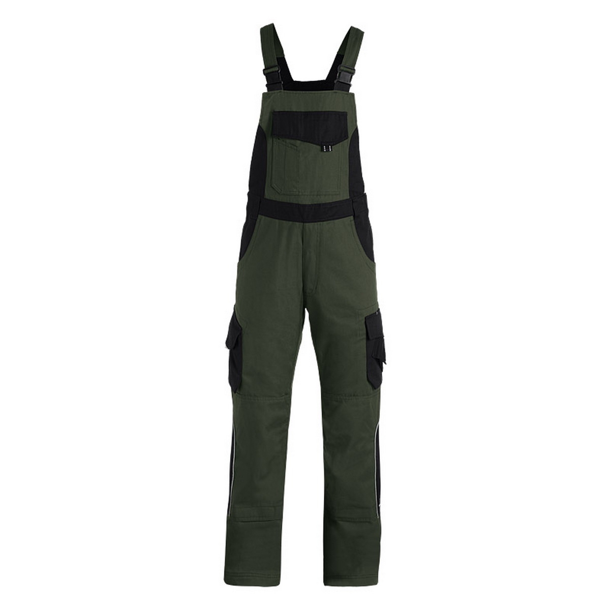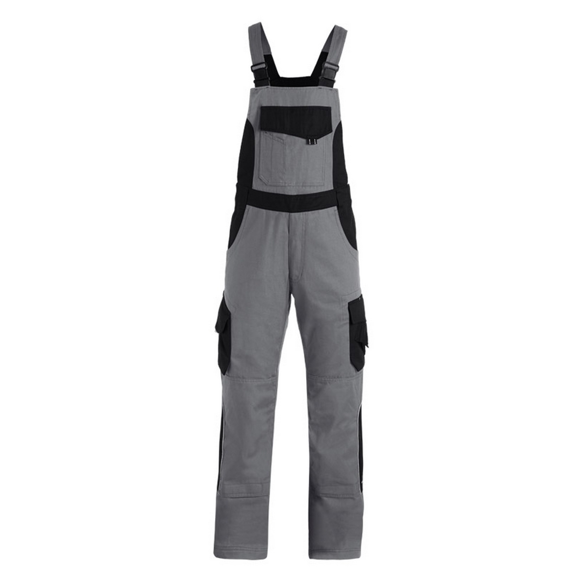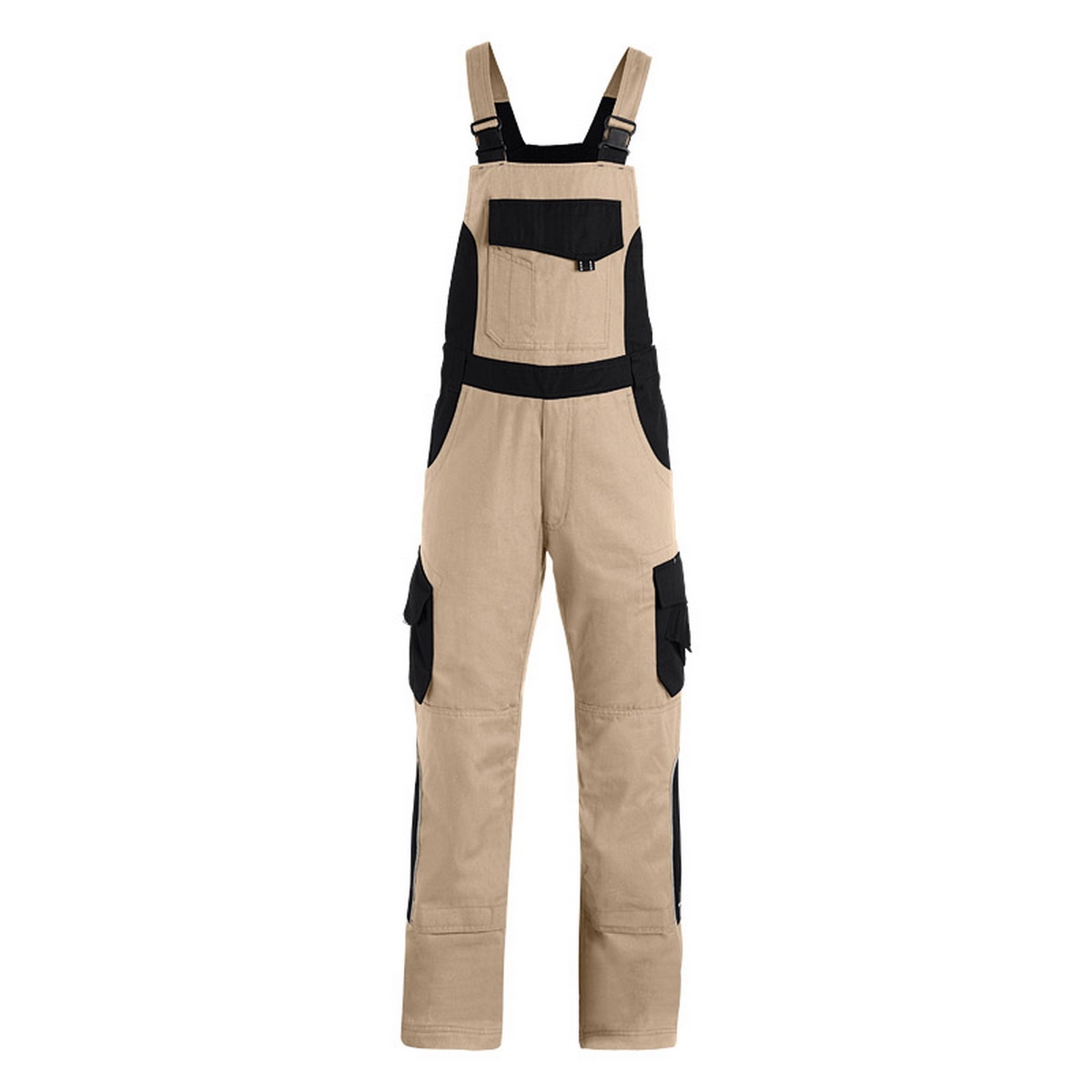Twill, 65% Baumwolle / 35% Polyester - ca. 300 g/qm 2 große Seitentaschen, 2 große Gesäßpattentaschen rechts 1 Zollstocktasche mit Stifttaschen, links Beintasche und Handytasche große Latztasche mit Stifttaschen und Patte vorgeformte Kniepolstertaschen